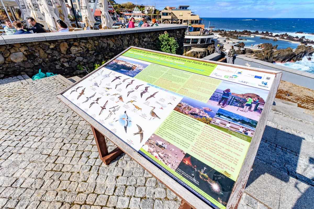 Die Bucht von Porto Moniz ist zudem ein bedeutender Lebensraum für zahlreiche Vogelarten. Vor allem Seevögel nutzen die Felsküsten und vorgelagerten Klippen als Brut- und Rastplätze. Mit etwas Geduld lassen sich Möwen, Sturmtaucher und andere atlantische Vogelarten beobachten, die über dem Wasser kreisen oder auf den Felsen ruhen. Für Naturfreunde und Hobbyfotografen bietet die Region damit hervorragende Möglichkeiten zur Tierbeobachtung in freier Umgebung. Die vergleichsweise geringe Bebauung und die klare Luft tragen dazu bei, dass Porto Moniz bis heute ein Rückzugsort für viele Vogelarten geblieben ist. Eine große Hinweistafel im Hafen zeigt die Vielfalt und erklärt die Arten zur besseren Erkennung.