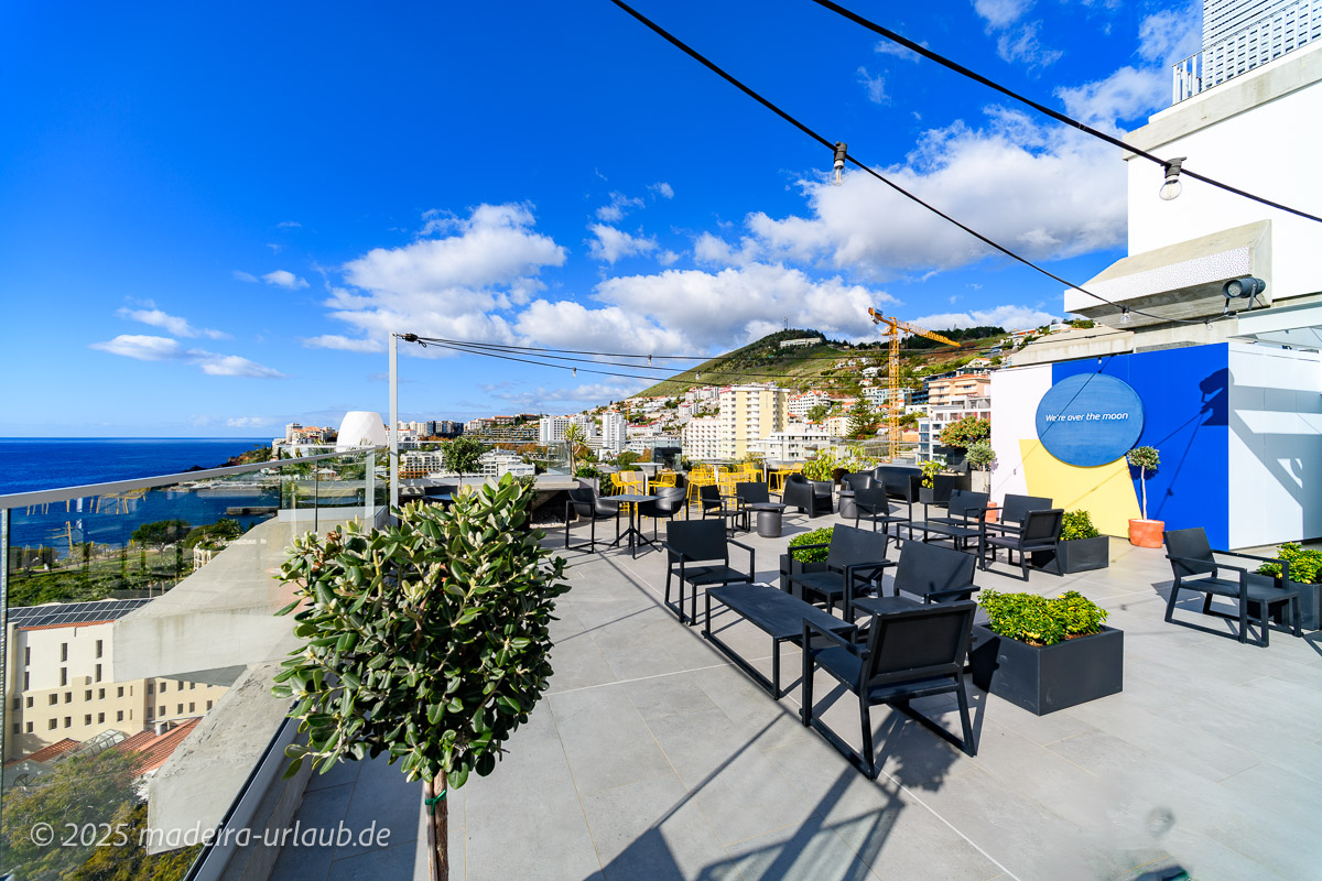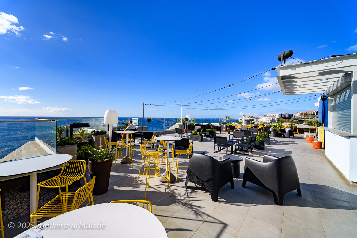 So wurden innen alles renoviert und achtsam liebevoll renoviert und ist auf dem neuesten Stand. Wer sich somit dem Hotel näher widmet, wird begeistert sein - vor allem durch den gigantischen Ausblick der Dachterrasse im 11. Stockwerk. Dort ist ab 16 Uhr eine Bar geöffnet und bietet Getränke und Snacks bei einem grandiosen Ausblick auf das Meer und die Bucht von Funchal.